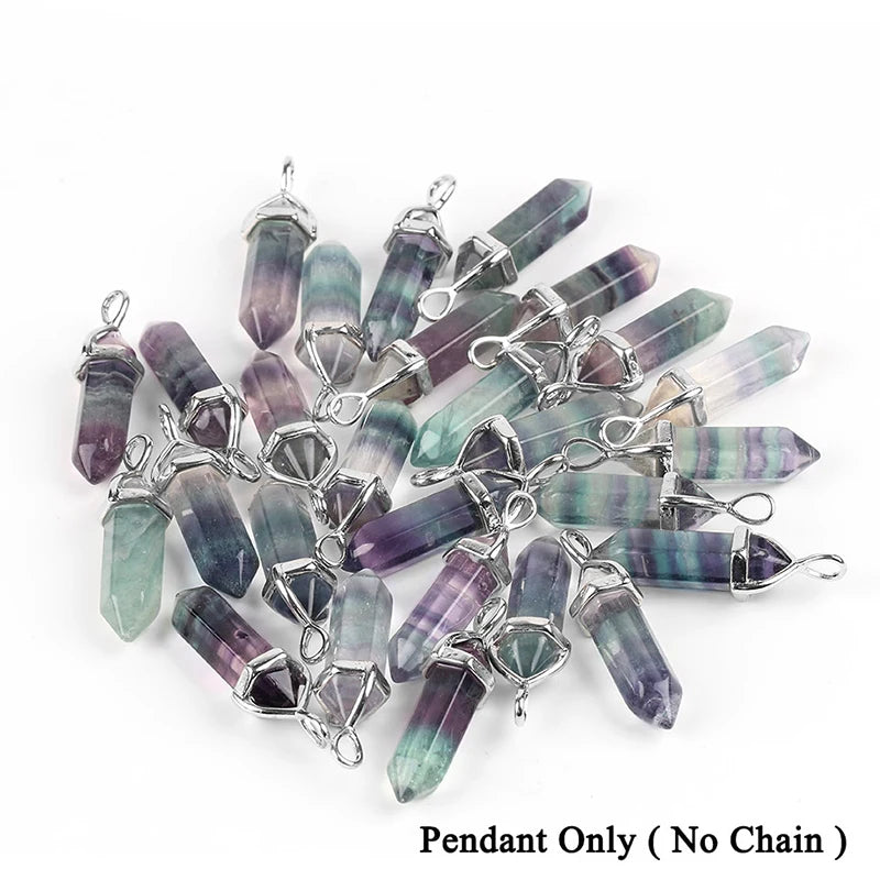 Genuine fluorite gemstone cut into a polished hexagonal point, suspended on a durable chain or cord.