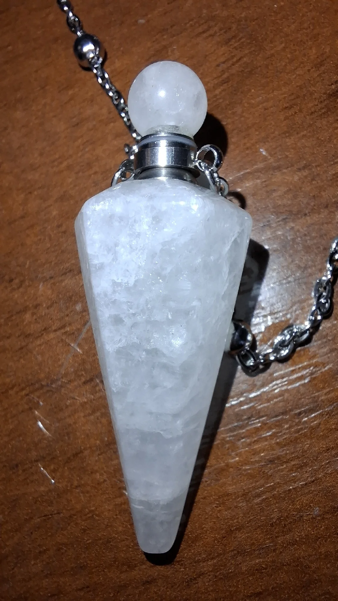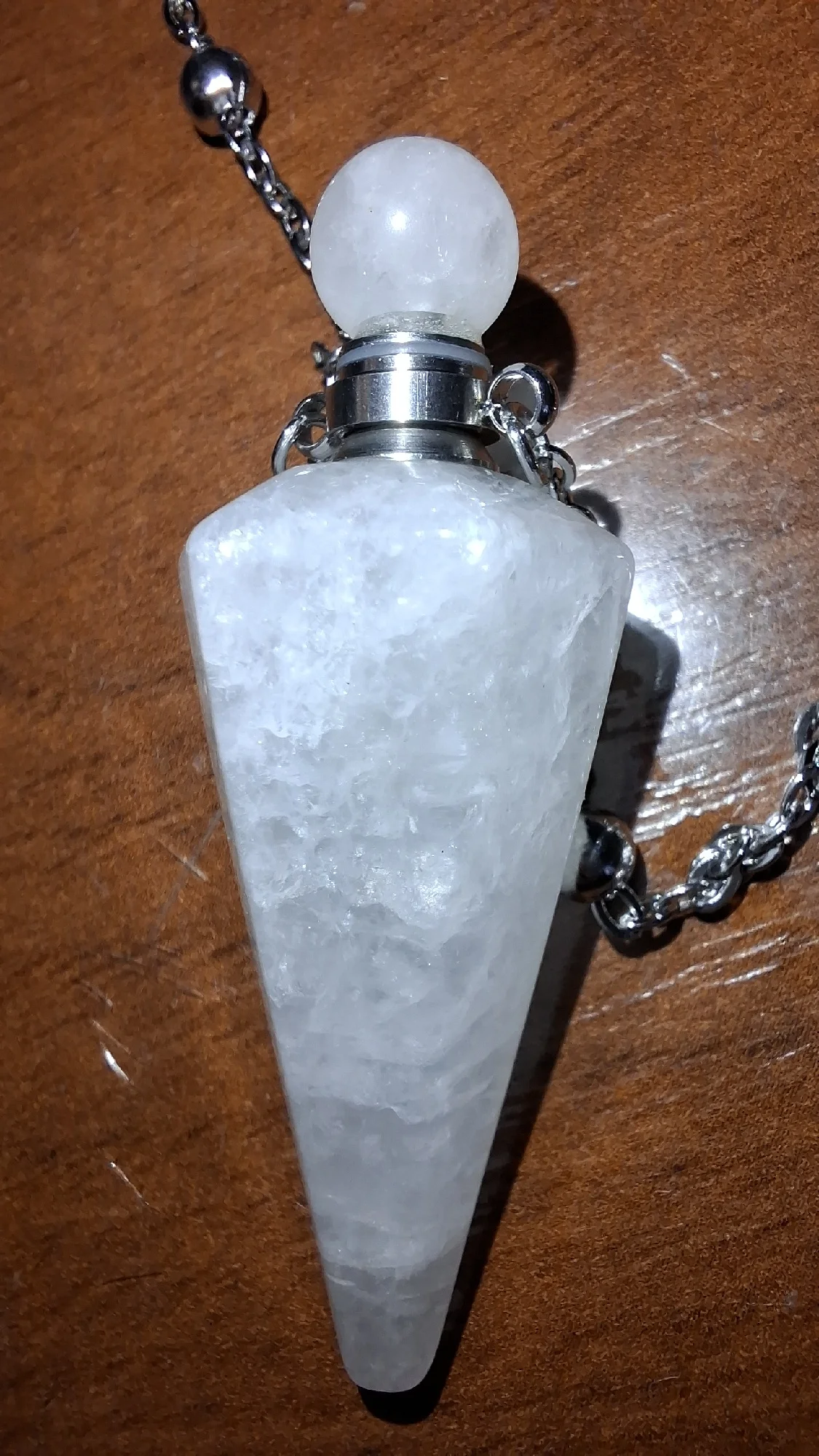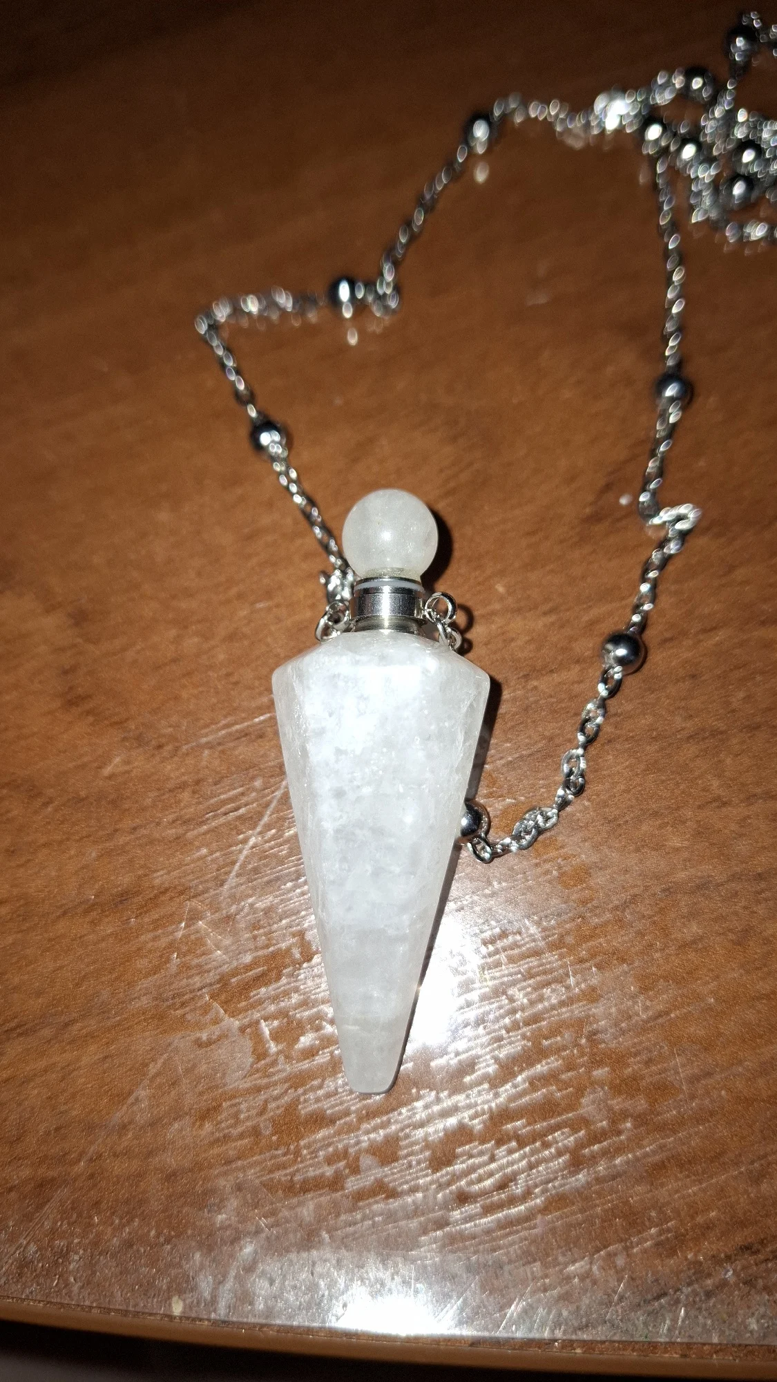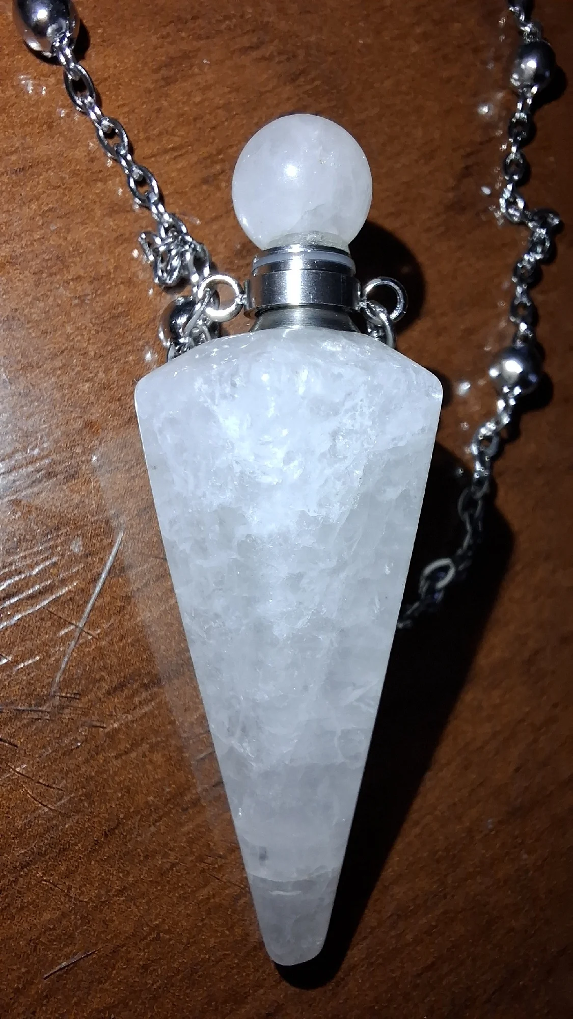 Genuine Clear Quartz crystal, hand-carved into a cone-shaped vial with a screw-cap top and matching necklace chain.