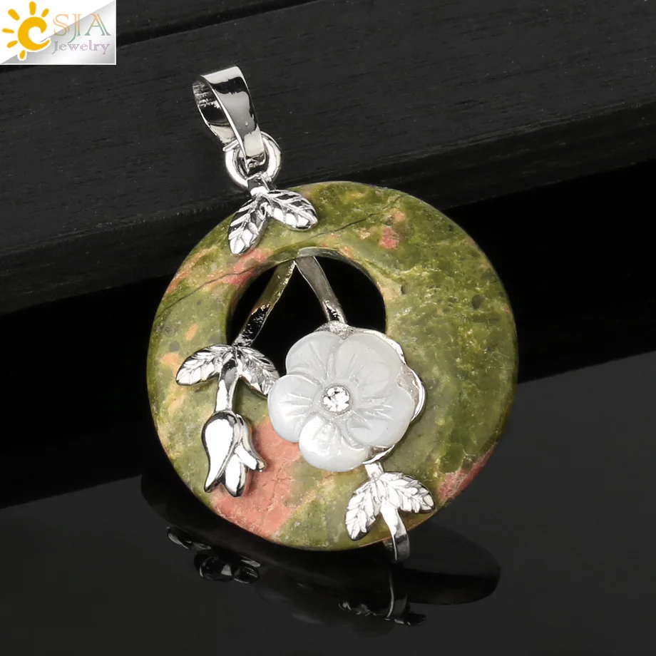 Natural Stone Donut Pendant – Round Flower & Leaf Design for Reiki Healing & Necklace Making