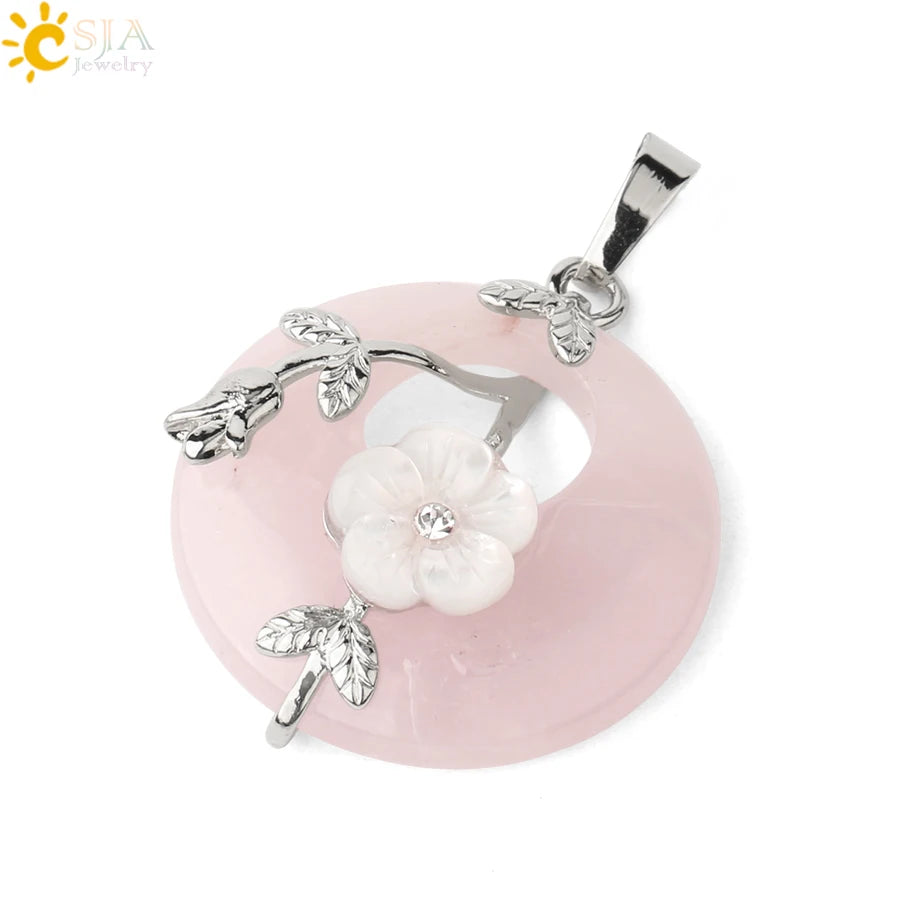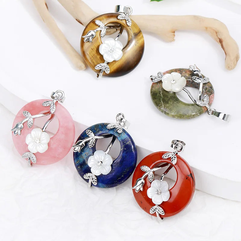 Add spiritual charm and healing energy to your style with this Natural Stone Donut Pendant, featuring a polished round design with elegant flower or leaf details. Available in Amethyst, Rose Quartz, Black Onyx, and more.