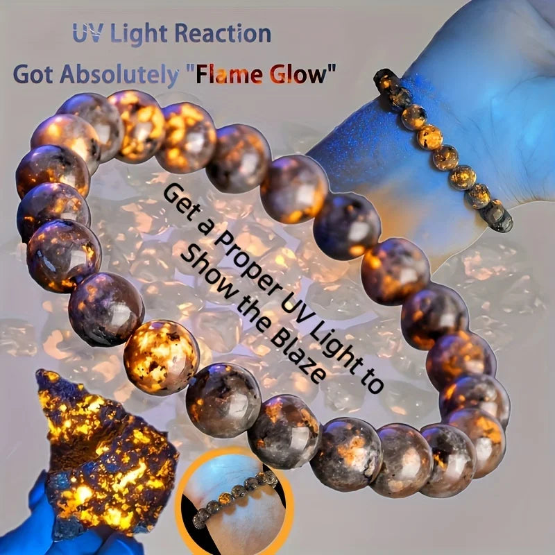 Experience the magic of Natural Yooperlite with this stunning flame-patterned bracelet that glows under UV light. Perfect for meditation and daily wear, its adjustable stretch design fits comfortably on both men and women.