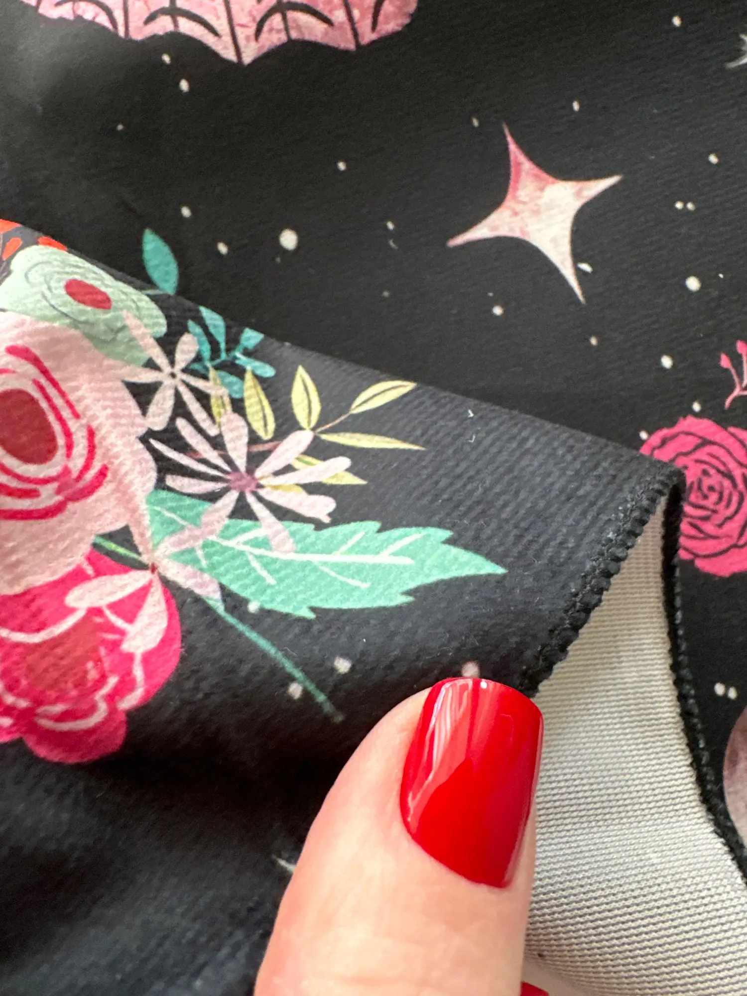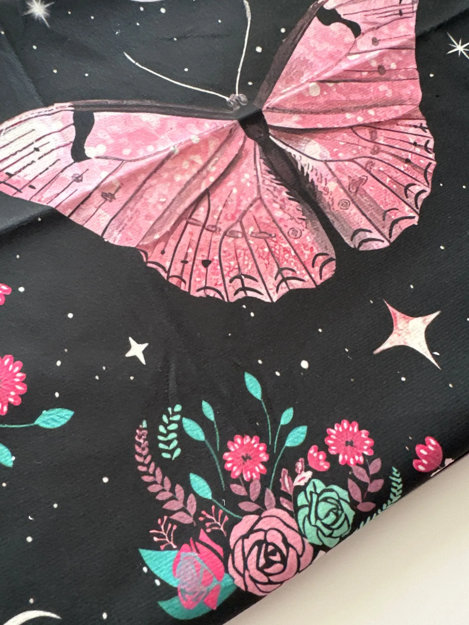 Soft, high-quality fabric printed with delicate moon phases, butterflies, and floral patterns in soothing pink tones.